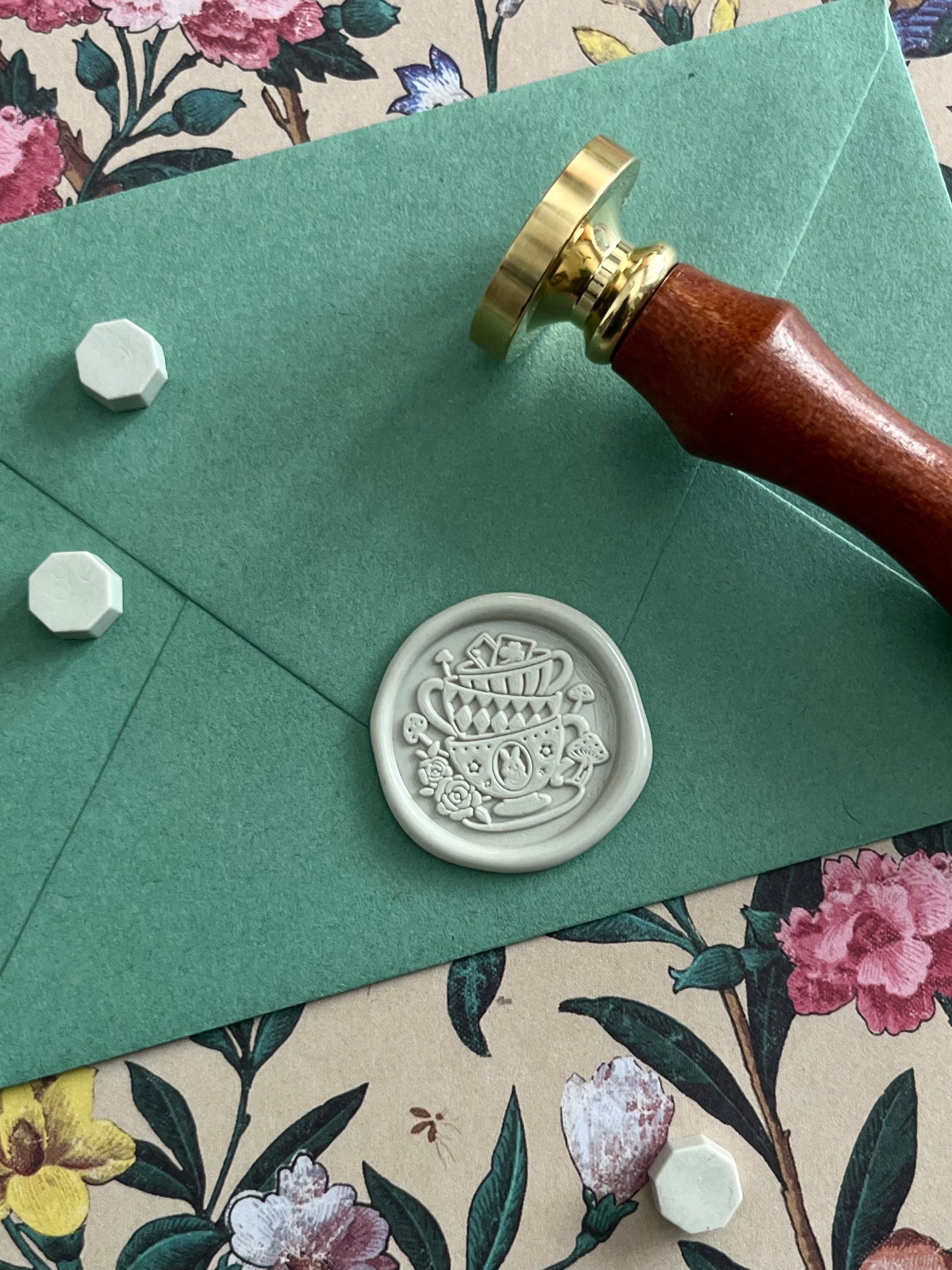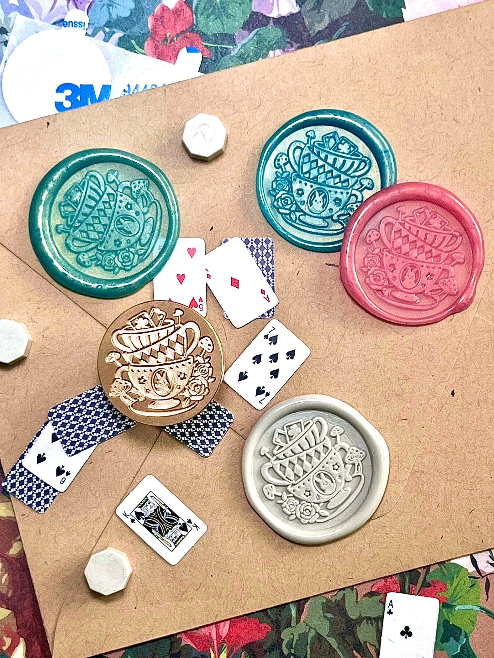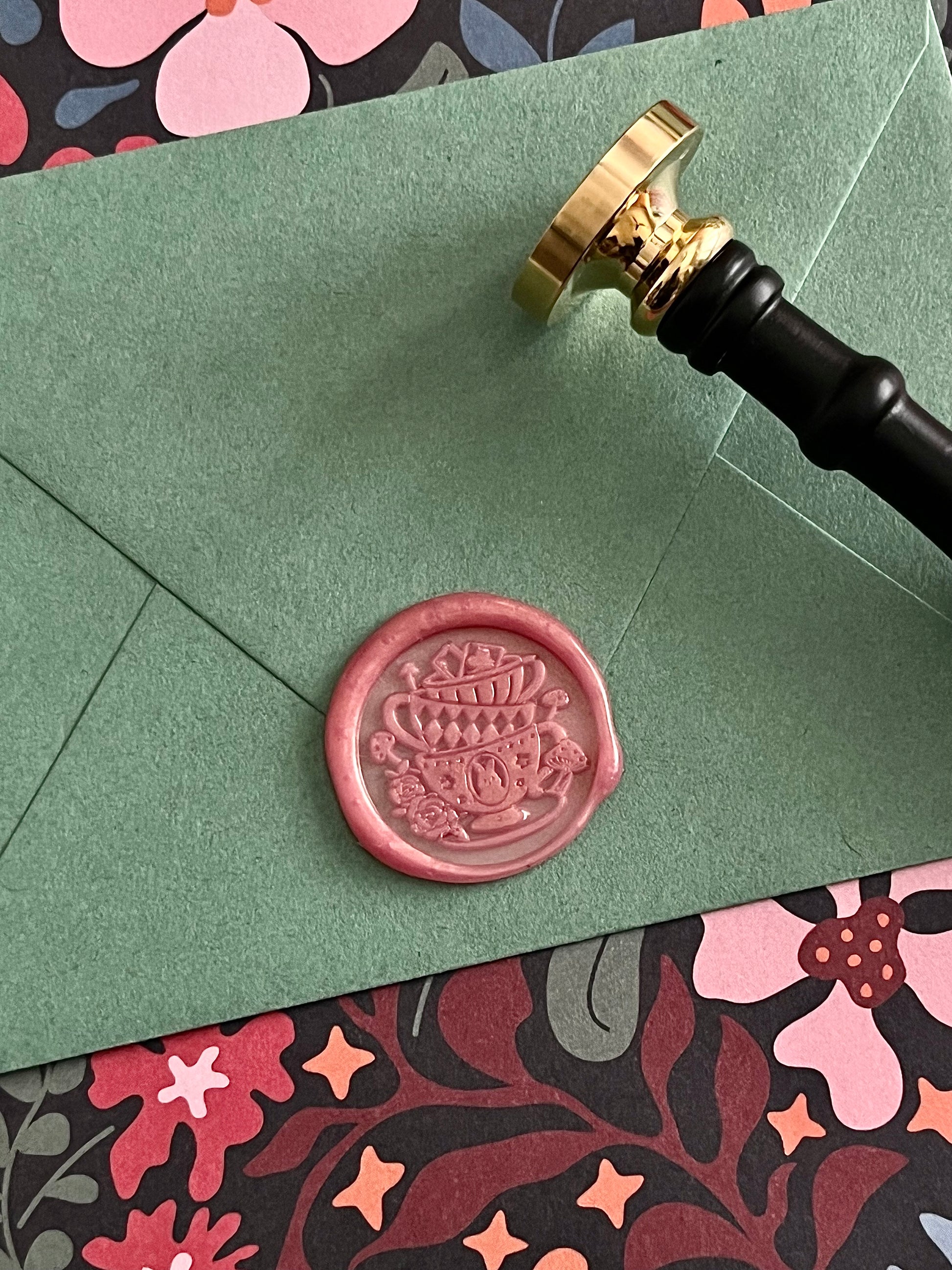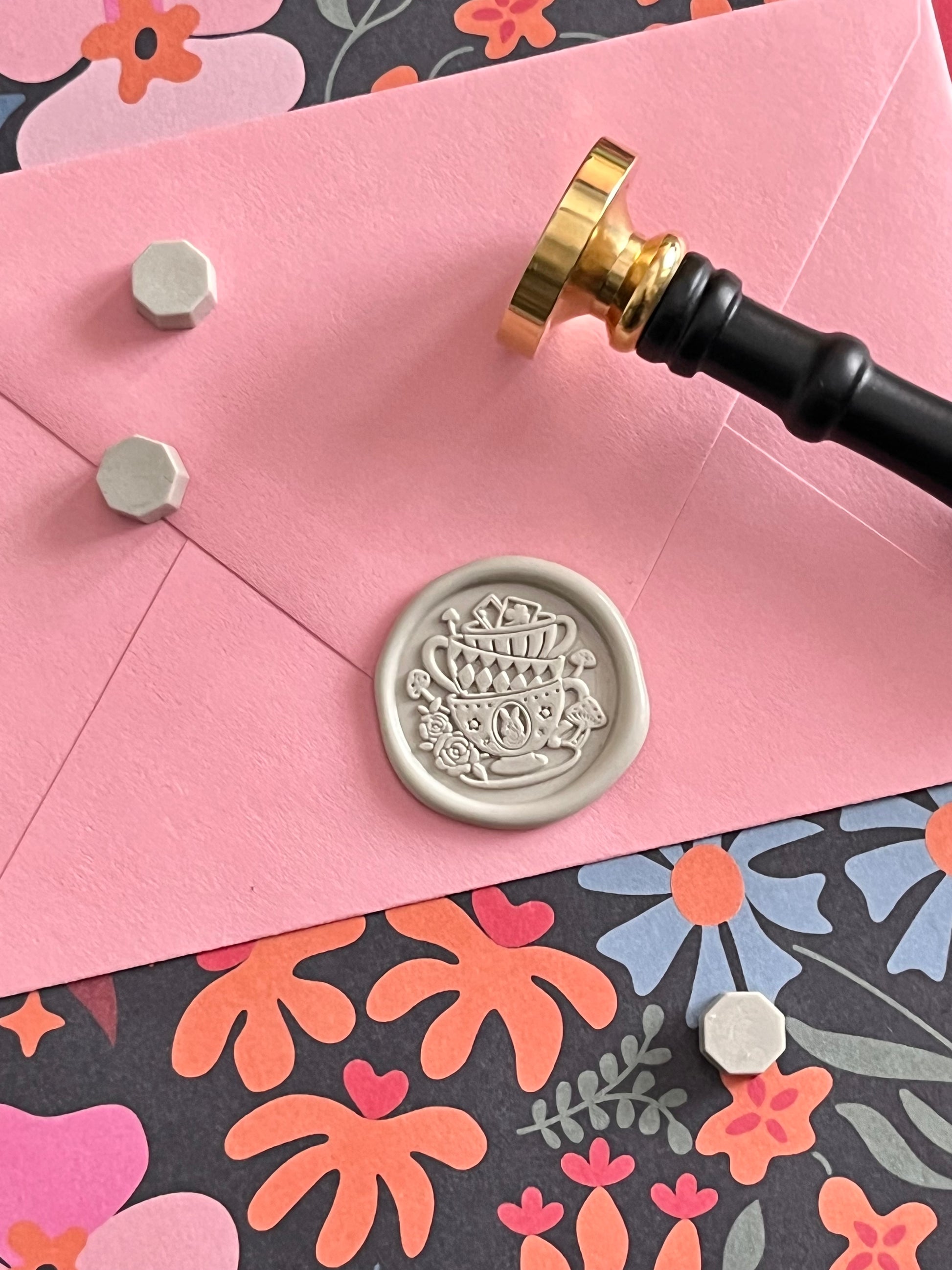 I’ve had several requests for Alice in Wonderland seals for the shop, and when I came across this stamp (with its adorable stacked tea cups 🤩) and its sister stamp, Curiouser and Curiouser, I’m like, “Yep, those are them 😍!!”