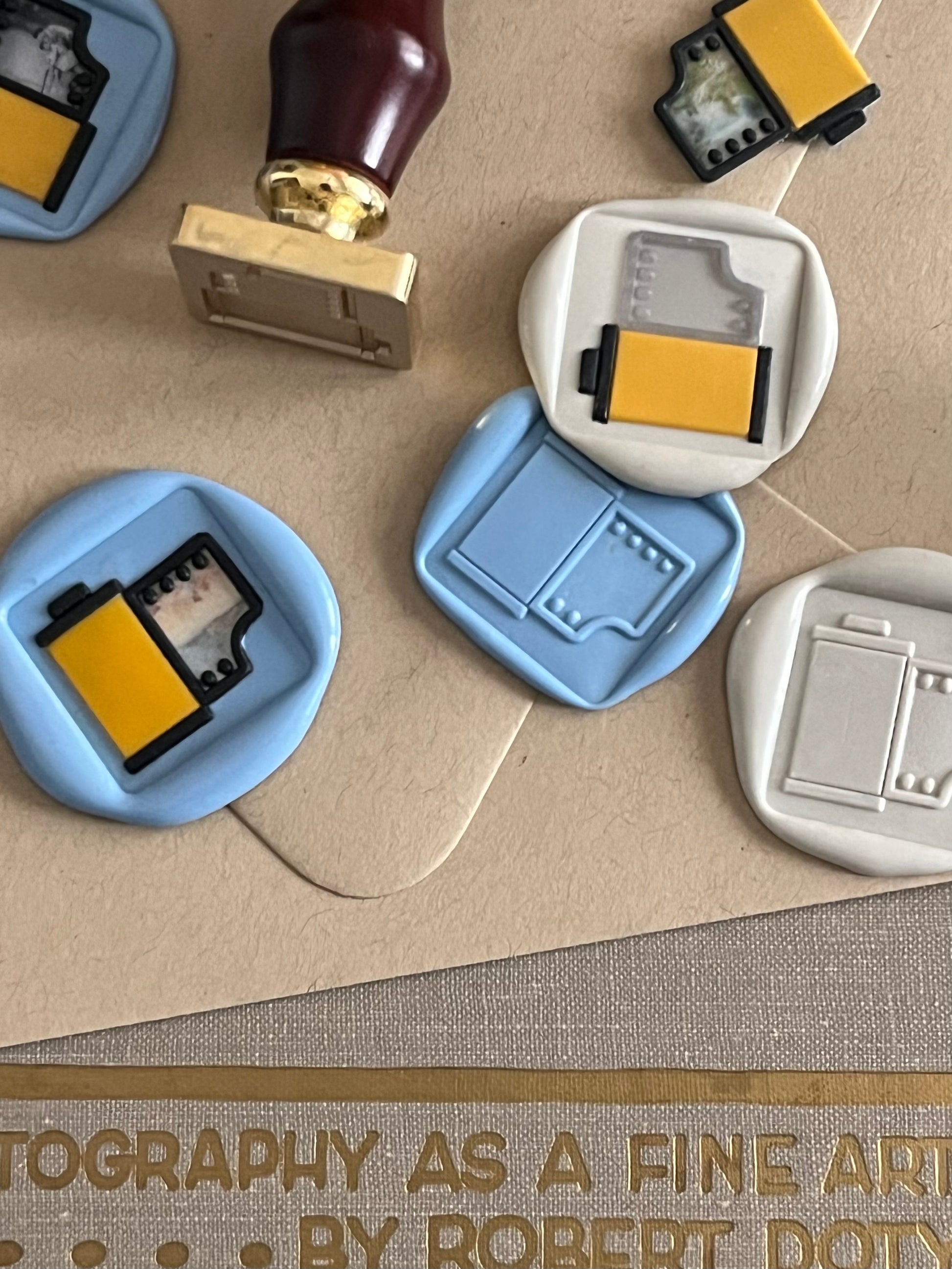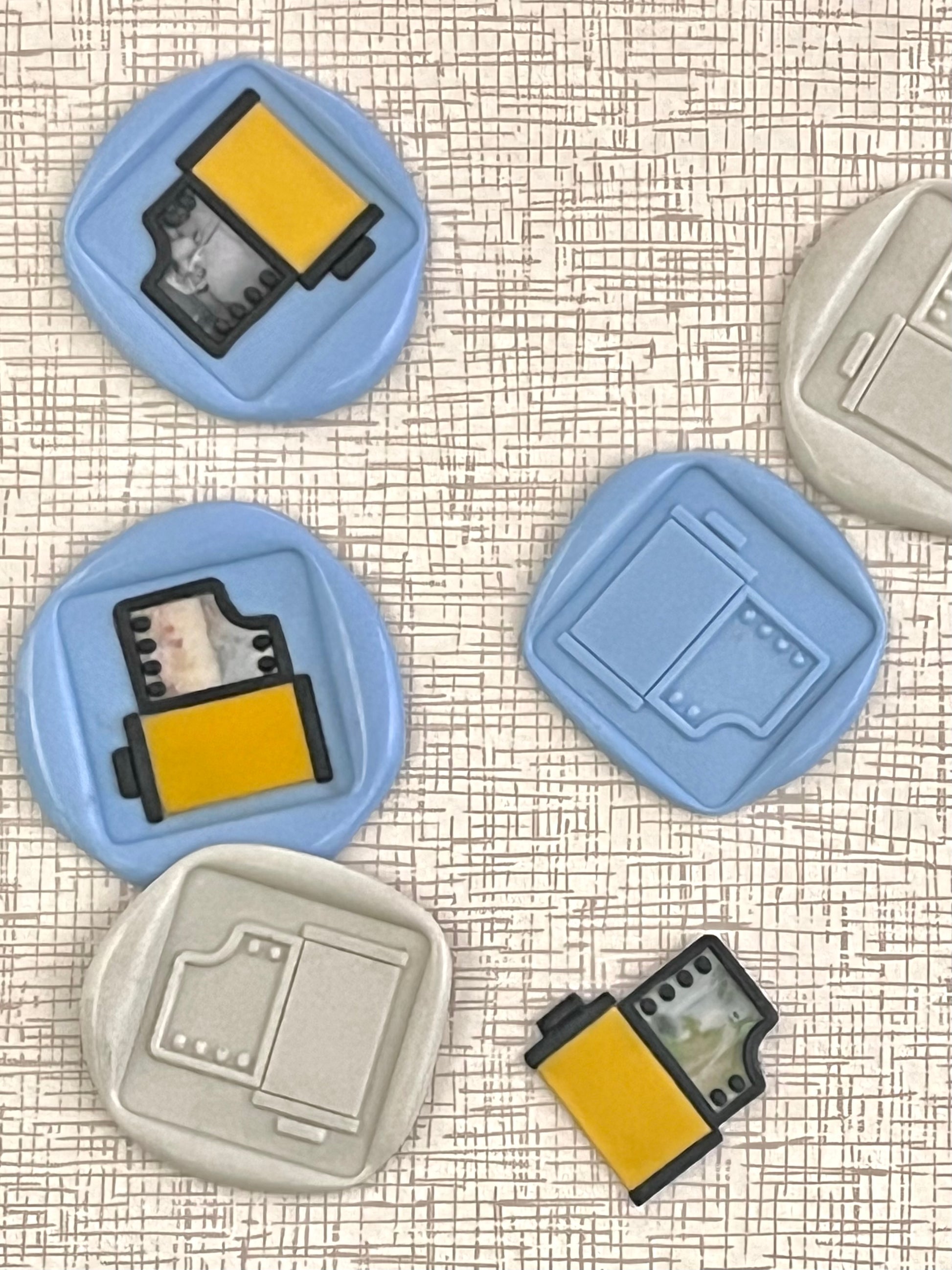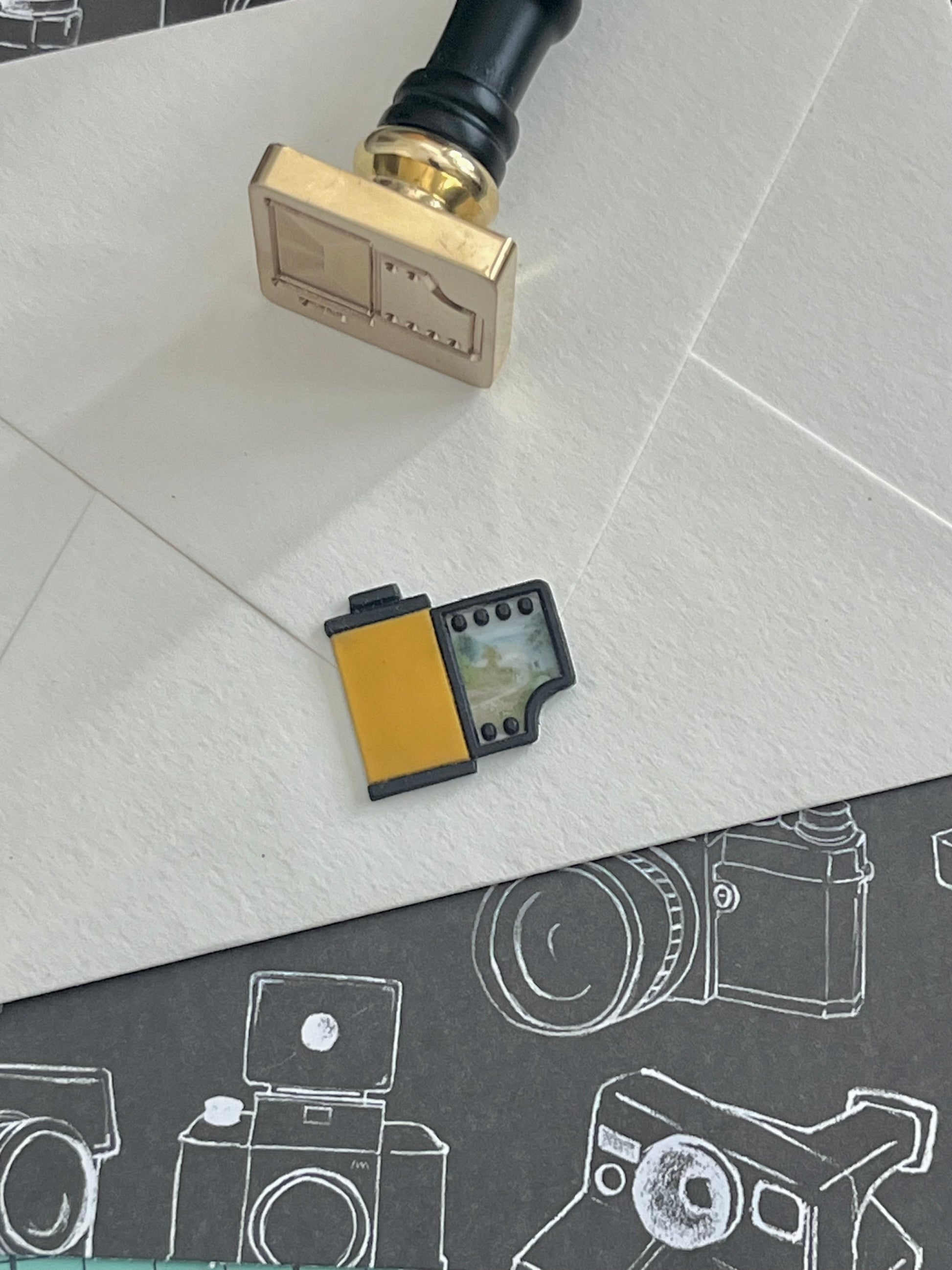 Wanna take it a further step further, lol?! Turn the film into a frame 🤩!! How?! First, pour and scrape the stamp with a blackish color, then pour clear wax over your tiny photo, press stamp, cut out around film and set aside. Pour and scrape the film roll, and place the picture/film back into the stamp. Then press into a background color. Clear as mud, lol?! Not the easiest of processes, but totally worth the time 🤩