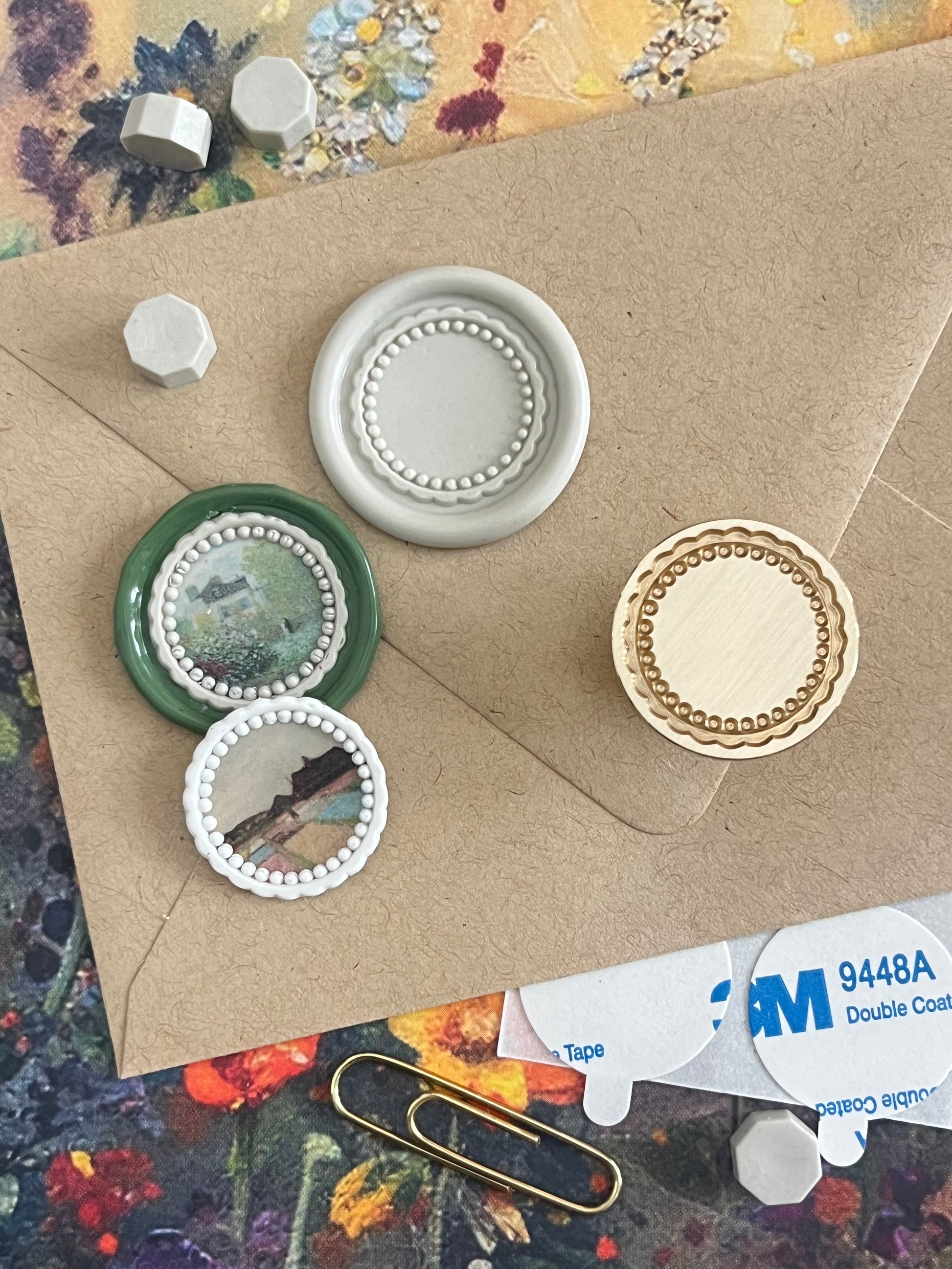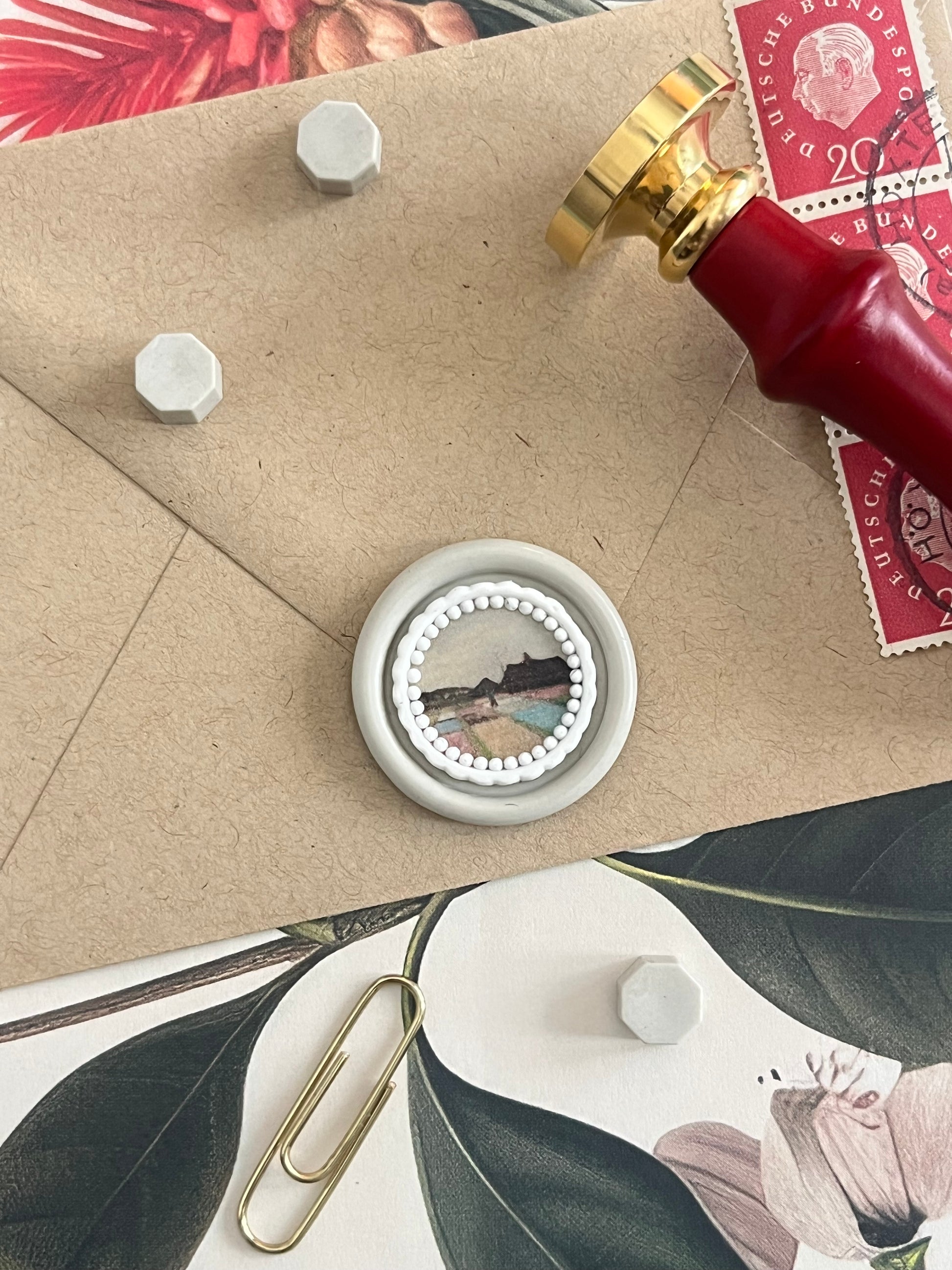 When I purchased this stamp for the shop my original thought was: Round Postage Frame 🤩!! It reminds me of the forever stamps USPS released a couple of years ago that looked like pin back buttons. But then I’m like, it has a scalloped edge, which is more of a seal than a postage stamp, so that’s what I settled on 😌