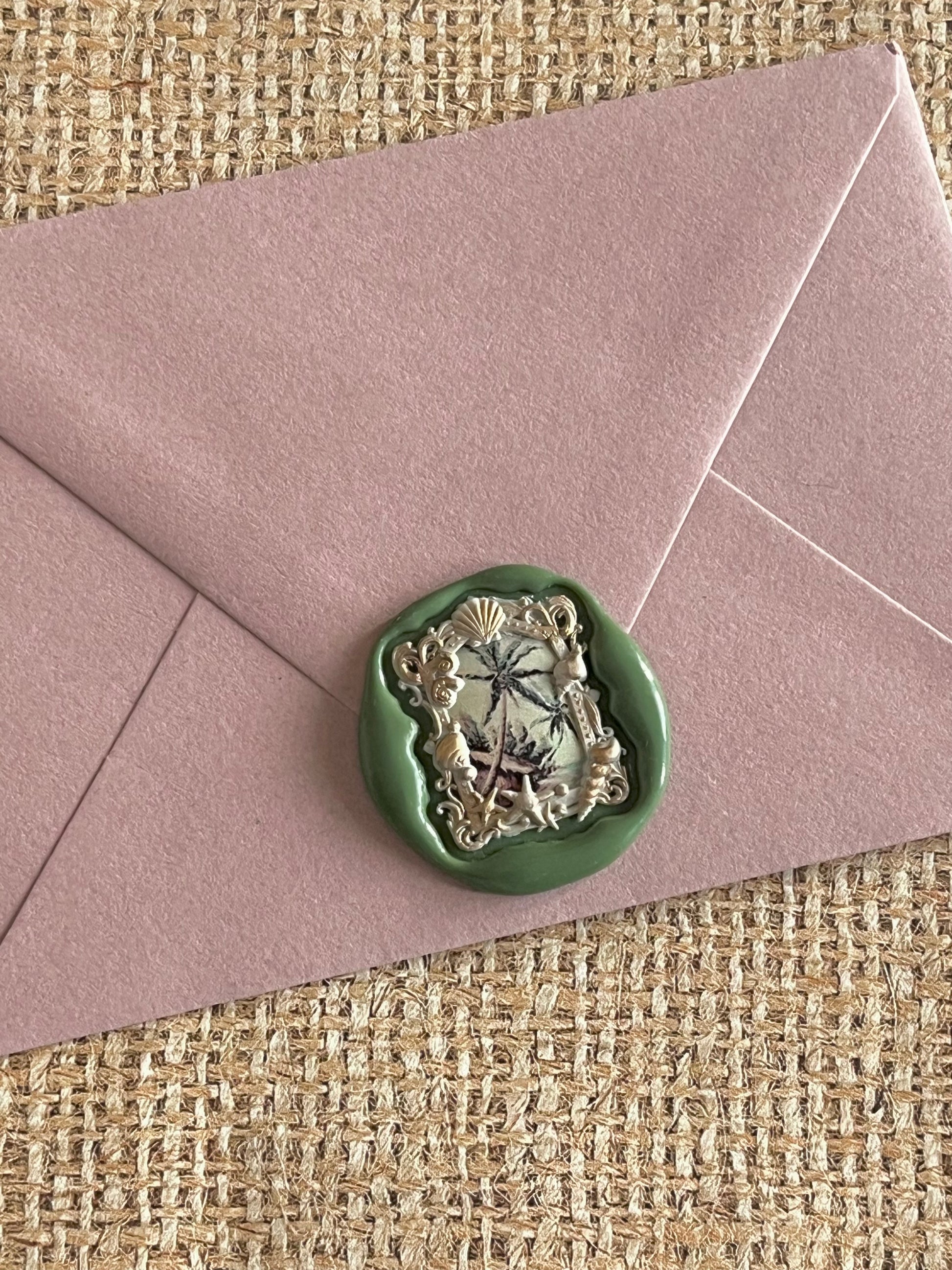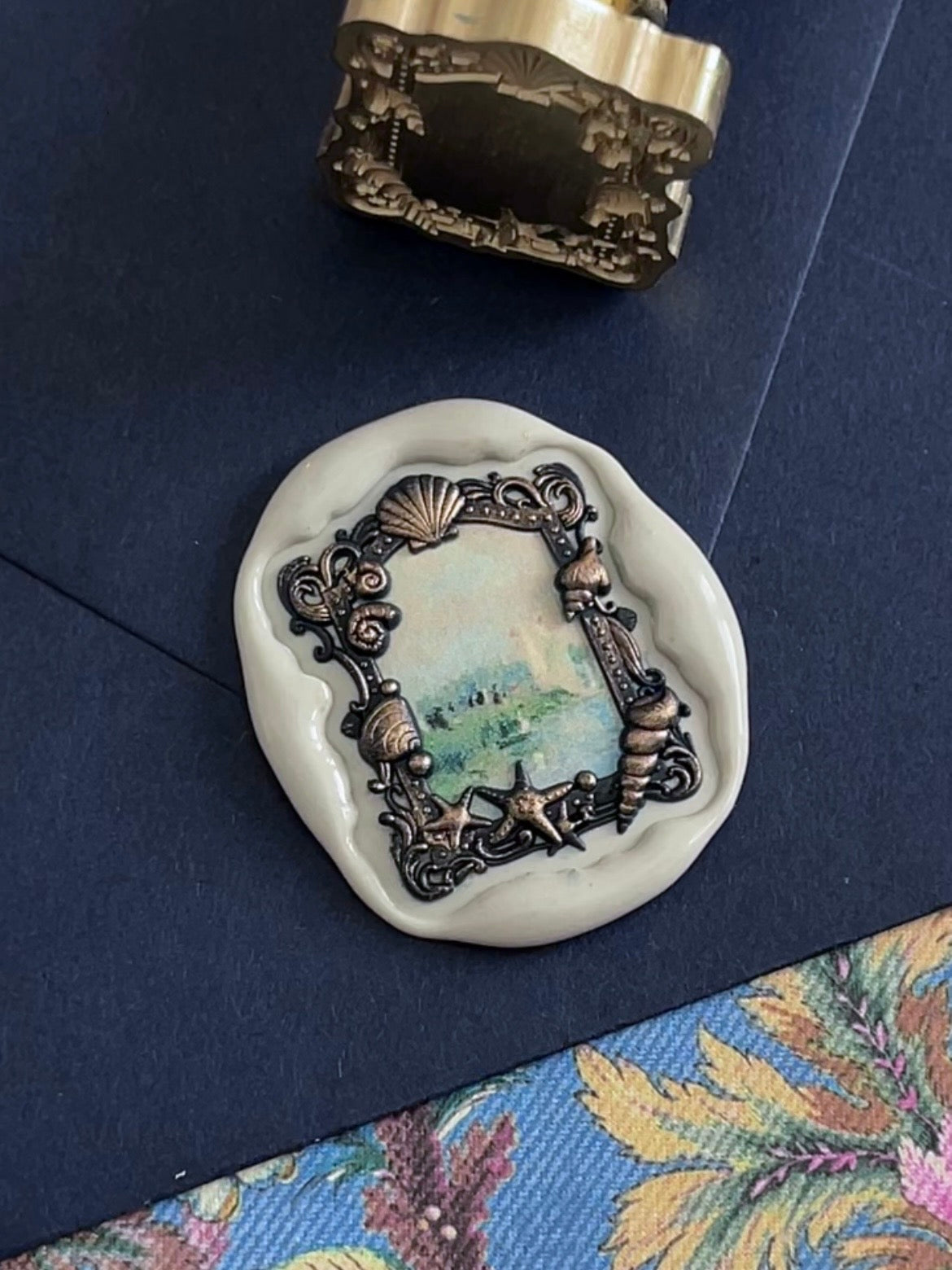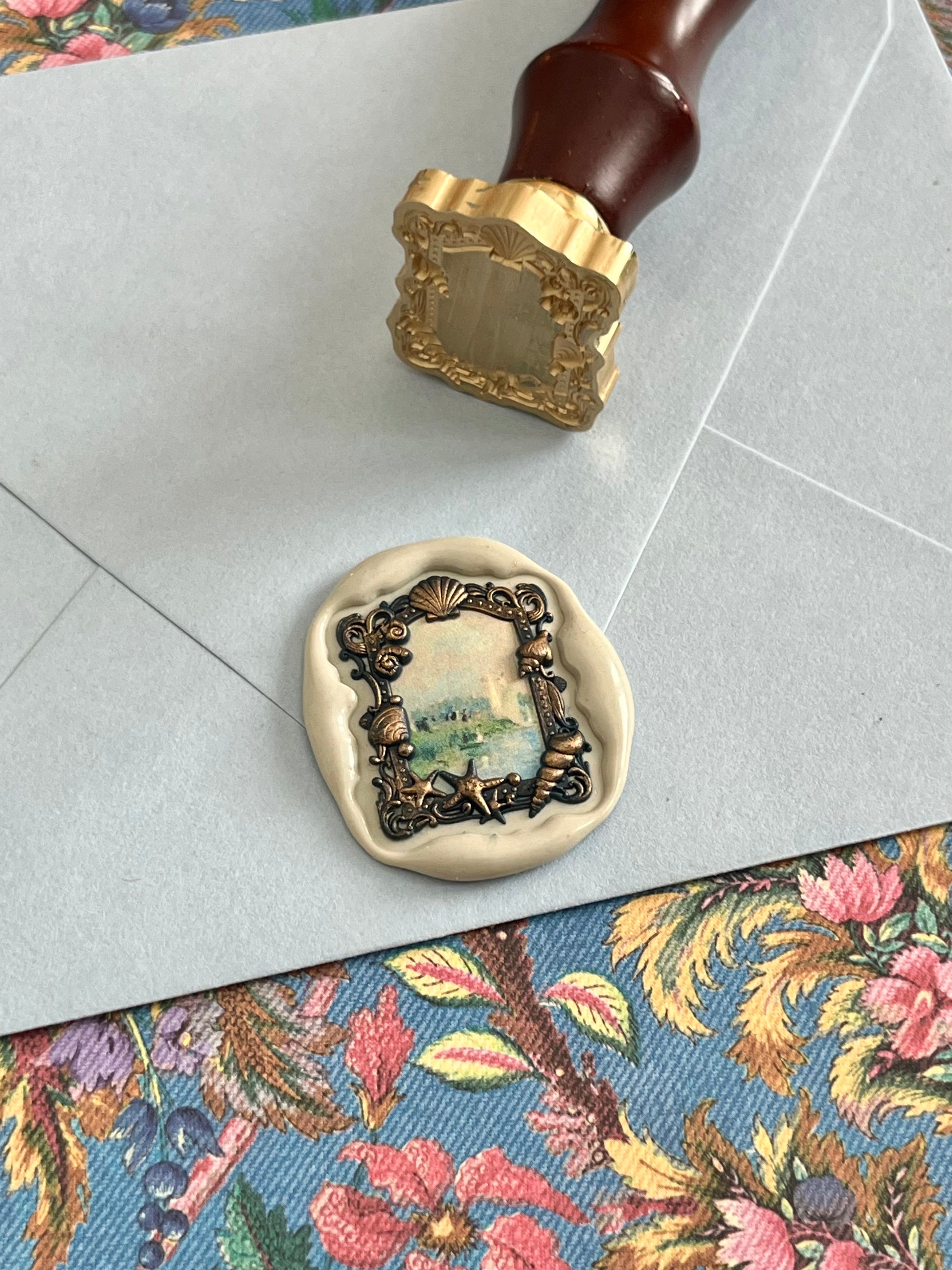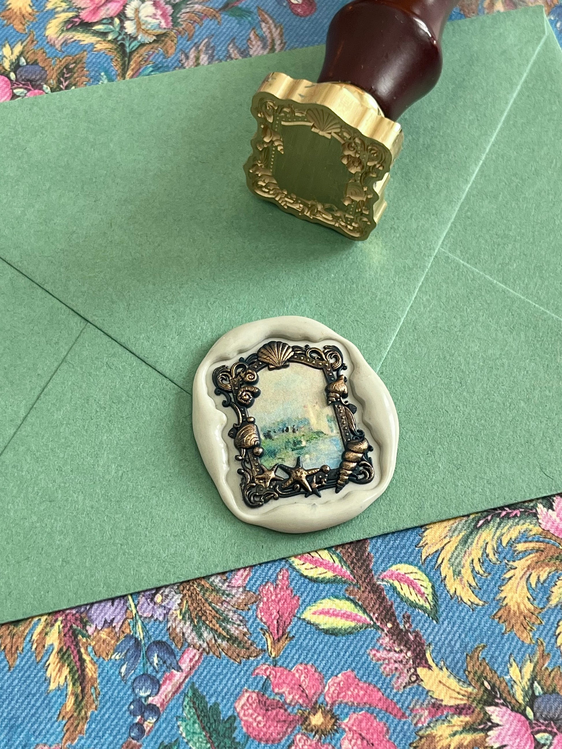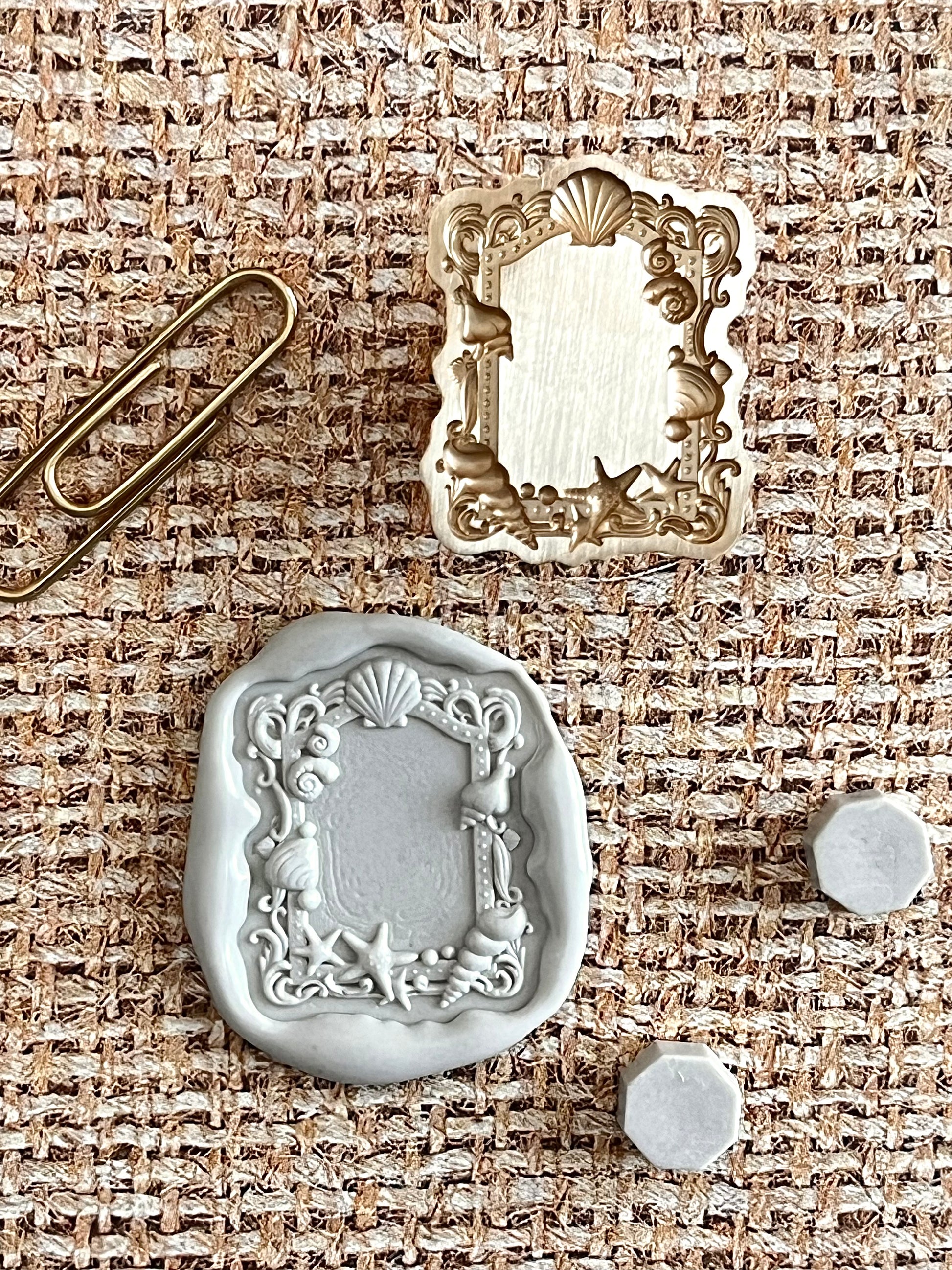 Seashell frame stamp head measures approximately 1 1/8” X 7/8”